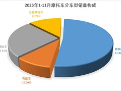 1-11月,摩托车生产企业完成工业总产值1205.76亿元,同比提高7.59%;完成工业销售产值1207.06亿元,同比提高7.38%;完成工业增加值223.29亿元,同比提高9.99%。